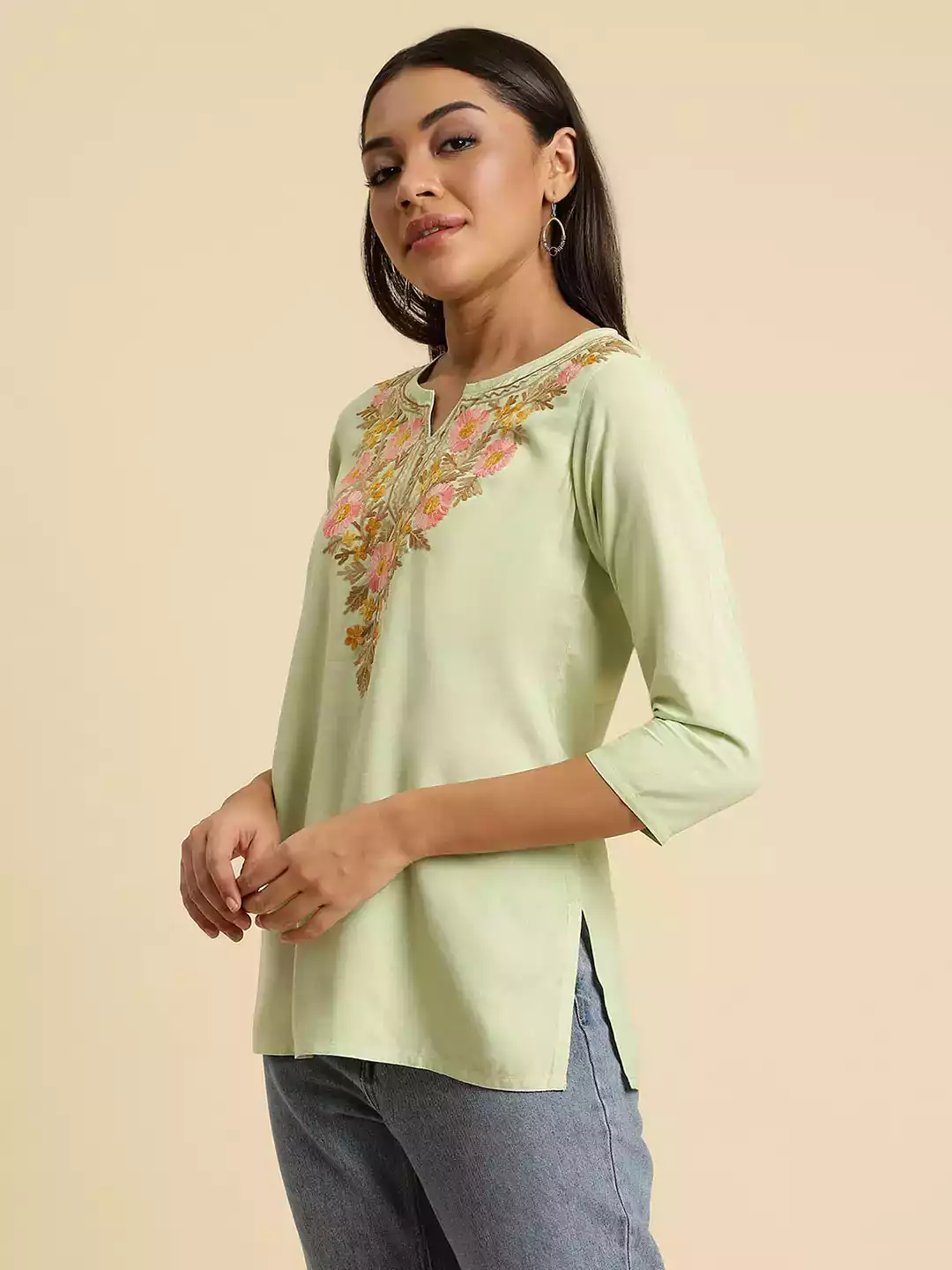 Pista Green Pashmina Work Short Kurti